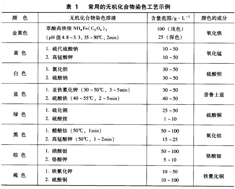 无机颜料染色一般是通过常温下在金属盐溶液中进行浸渍,将有颜色的无机化合物引人阳极氧化膜的微孔中实现的。(导读:大朗氧化厂家告诉您哪些因素会影响铝合金阳极氧化着色 http://www.hswj66.com/Article/yingxianglvhejinyang_1.html)无机颜料染色有一步法和两步法两大类,草酸铁钱染金黄色是目前典型的一步法无机颜料染色工艺。大部分无机物染色是两步法完成的,例如无机颜料染白色,先在氯化钡溶液中浸渍几分钟,清洗后再在硫酸钠溶液中浸渍几分钟,两种化合物反应生成白色的硫酸钡沉积在阳极氧化膜微孔之中。常用的无机颜料及阳极氧化染色工艺如表1所示,除了第1行是一步法阳极氧化染色之外,其余均是两步法无机染色工艺。表1给出了无机化合物的含量范围,含量高者染色比较深,可由用户自行调整使用。